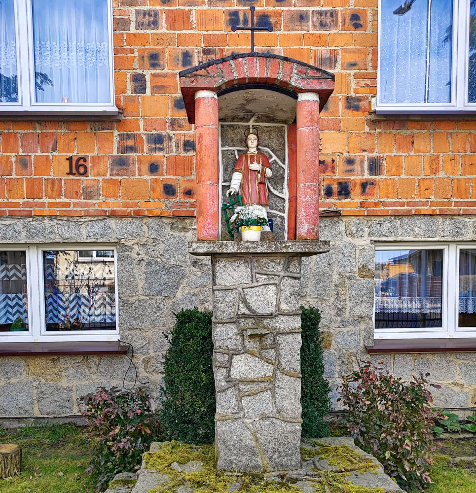 Przydrożna kapliczka kolumnowa z figurą św Wawrzyńca przy ulicy 3 Maja. Jerka, gmina Krzywiń, powiat kościański.